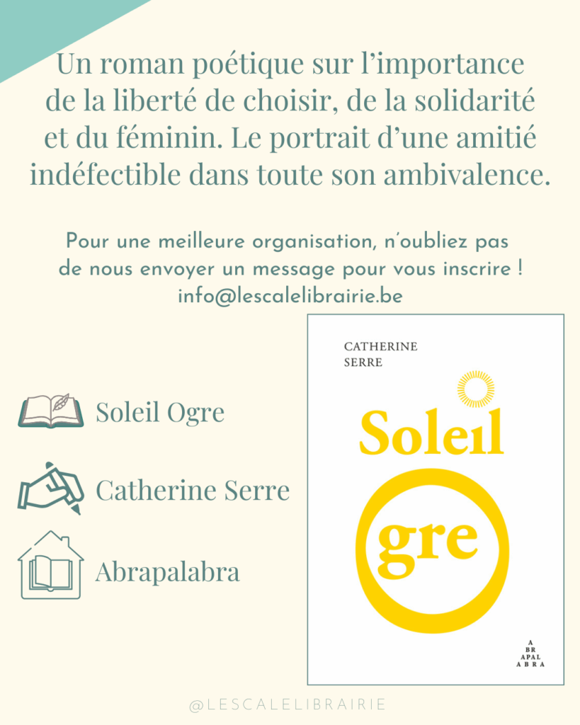 Rencontre avec Catherine Barsics et Catherine Serre – 27/11/25 à 18h30 Dans le cadre de Lisez-vous le belge ?, nous avons la joie d’accueillir deux autrices qui vont dialoguer pour vous offrir une soirée pleine de beauté.Inscription via info@lescalelibrairie.be – PAF: libre Je m'inscris Vous devriez également aimer L’escale est en vacances 3 août 2024 Reprise des bavardages littéraires ! 2 septembre 2025 Rencontre avec Paul De Ré – 03/04/25 à 18h30 18 mars 2025