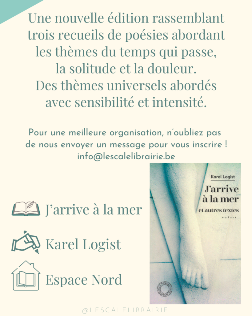 Rencontre avec Karel Logist – 29/01/26 à 18h30 Venez découvrir la réédition de trois recueils de poésies de Karel Logist le jeudi 29 janvier à la librairie ! Inscription via info@lescalelibrairie.be – Participation libre Je m'inscris Vous devriez également aimer Rencontre avec Alix Garin – 19/10/24 à 18h 27 septembre 2024 Rencontre avec Anna Ayanoglou – 12/04/24 à 18h30 29 mars 2024 Rencontre avec Line Alexandre – 20/09/24 à 18h30 4 septembre 2024